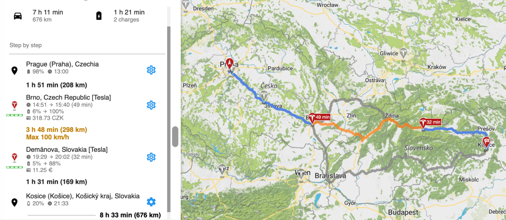 Testovaná trasa bola z Prahy do Košíc, ktorá cez Brno a Trenčín robí dohromady 690 km. To už je celkom slušná denná porcia kilometrov pre elektromobil. Na zmieňovanej trase je niekoľko Tesla superchargerov, či iných rýchlonabíjačiek pre núdzové zastavenie. Bol som si preto celkom istý, že do Košíc prídeme v rámci jedného dňa, alebo nie?