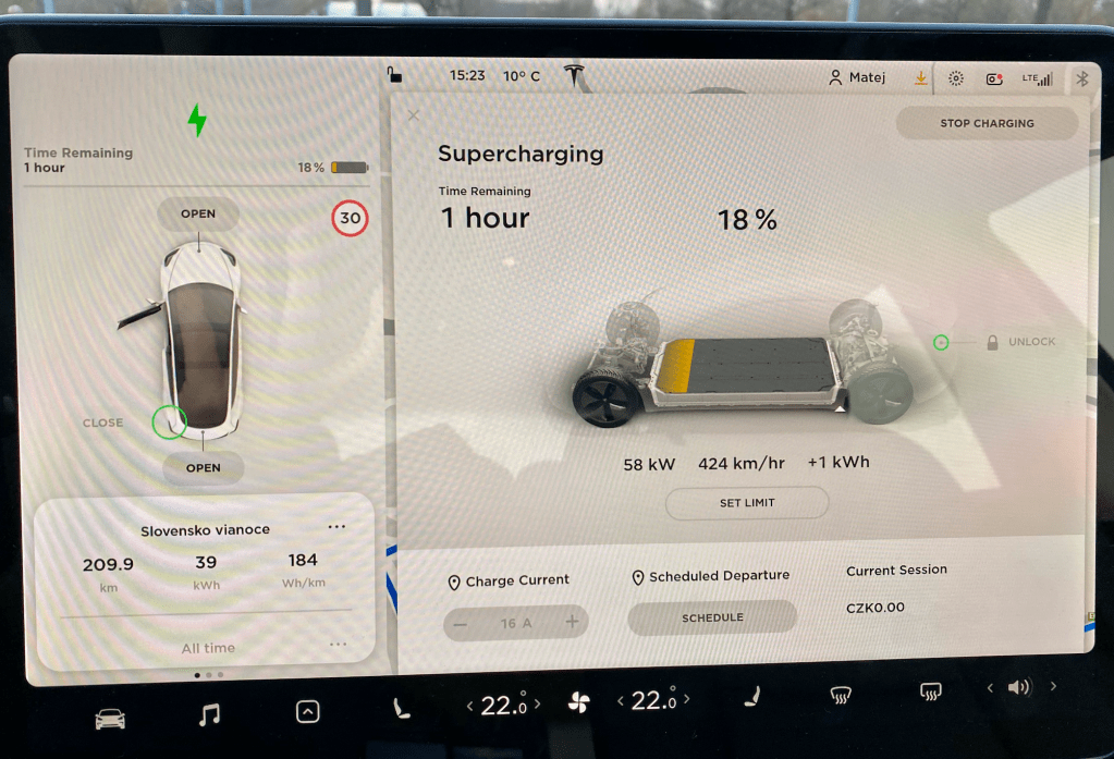 Vyrazili sme z Prahy 13:00 s 99% stavom batérie. Po diaľnici do Brna (je tam niekoľko obmedzení na 80 km/h) sme nakoniec dosiahli spotrebu 18,4 kWh na 100 Km. Celkom slušné číslo a tak nejak som podobné, alebo ešte horšie hodnoty na diaľnici očakával. Dostali sme sa aj do cca 20 minútovej zápchy a dorazili sme k brnenskému Superchargeru 15:22. Dohromady sme dali túto trasu, ktorá je podľa google máp zvládnuteľná za 2 hodiny, celkom za 2 a štvrť hodiny. Išiel som väčšinu času 120 km/h a kúrili sme si na krásnych 21-22 stupňov Celzia. Teplota vonku ale nebola v žiadnom prípade pri bodoch mrazu. Celý deň sa držalo okolo 8-10 stupňov Celzia.