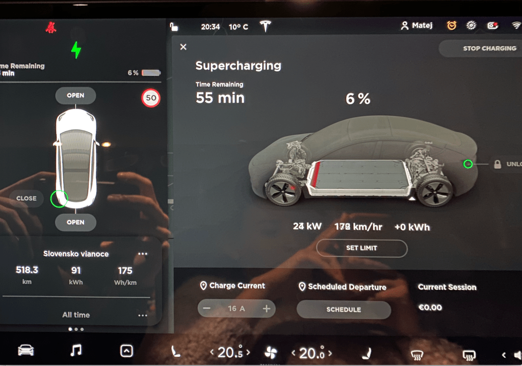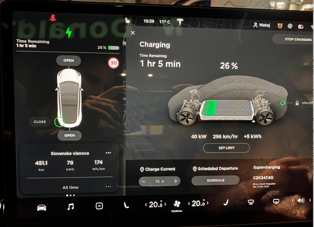 - Pri absolvovaní 700 km benzínovým autom a priemernej spotrebe 6,5 litra na 100 km, by ma cesta stála okolo 50 EUR. Elektromobil spotreboval 120 kWh, čo mňa momentálne vyšlo na 4 EUR. Ak by som nemal voľné km na Superchargroch a v Prahe som pred cestou nabíjal za štandardný tarif, celá cesta by ma vyšla na 30 EUR. Stále dobrá úspora oproti benzínu.