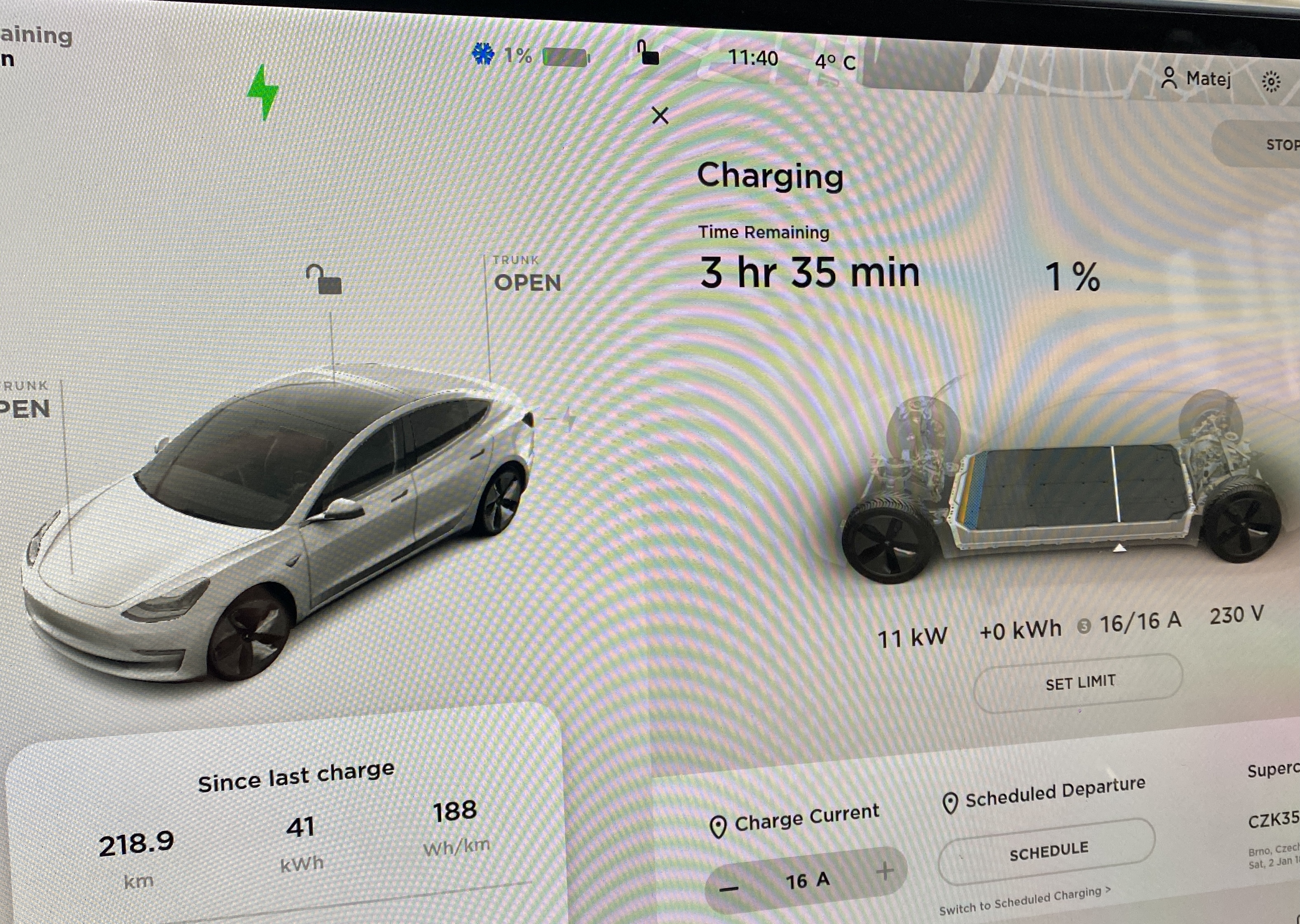 Ak si myslíte, že Tesla Model 3 môže mať v zime problém s naštartovaním, tak sa veľmi mýlite. Ak už sa cez zamrznuté dvere do auta dostanete, tak aj pri -15 °C, sa vám auto rozbehne úplne v pohode a nebude ho potrebné ani dopredu zahrievať. Máte po nejaký čas síce obmedzený výkon auta – to znamená v mojom prípade, že z 0 na 100 to dáte miesto 5,5 sekundy za 7, ale inak nebudete nič ďalšie pociťovať. Veľmi pravdepodobne budete mať aj obmedzené rekuperatívne brzdenie, pretože máte premrznutú baterku, ale to je opäť vec, ktorá mne osobne zas tak nevadí. Proste vám auto nebude tak efektívne na začiatku rekuperovať.