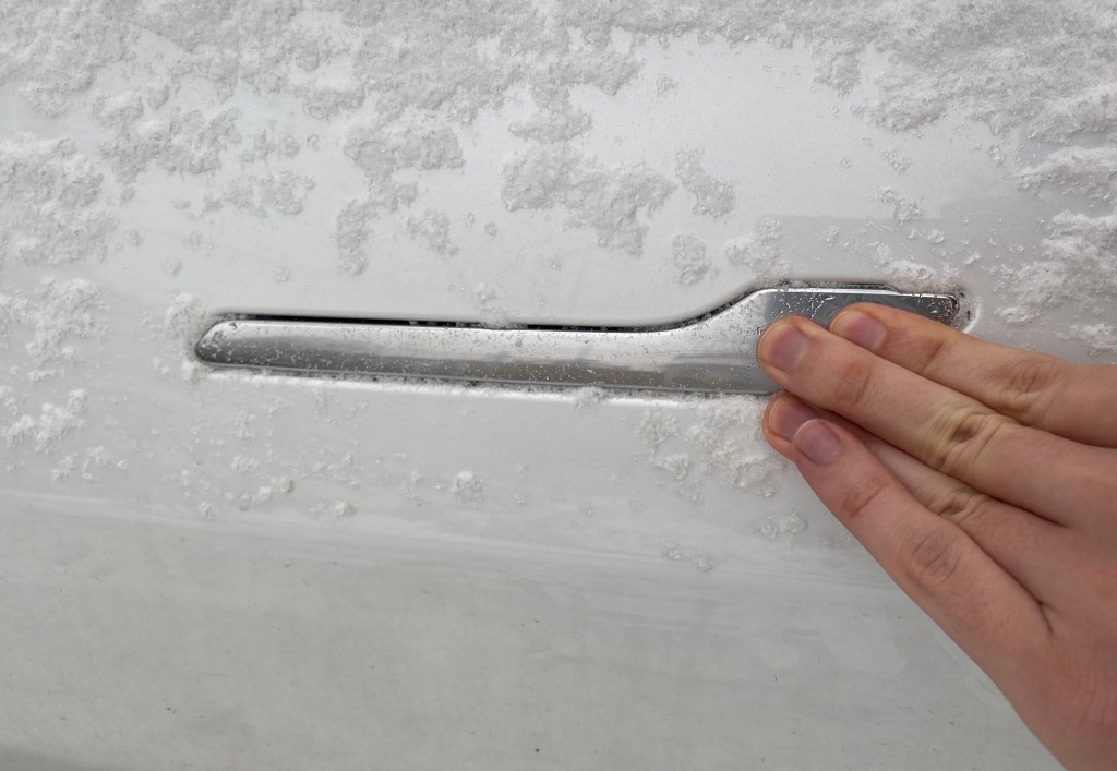 Problém pri týchto teplotách nastáva aj s kľučkou. Tá má veľmi zaujímavý mechanizmus – čo zistí aj väčšina ľudí, ktorý Modelom 3 nikdy nešli, ale o tom možno niekedy inokedy. Pri veľkých mrazoch vie táto klučka primrznúť a vy tak ani neviete kľučku dostať do polohy, ktorá by spustila otváranie dverí. Očakával som, že keď zapnem kúrenie dopredu na nejaký čas, tak sa zohrejú aj kľučky, opak je však pravdou.